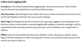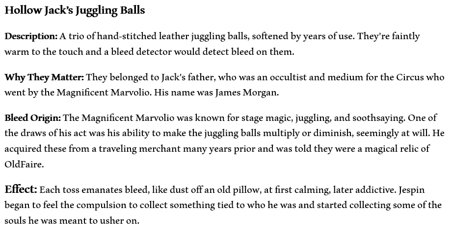 A psychopomp vanth called Jespin stumbled across some bleed-infested juggle balls when he came to collect Hallow Jack, son of the Magnificent Marvolio, his famous juggling father. Using the juggle balls leads to a ferocious appetite to collect things. Jespin couldn't help himself as he watched Milo pass near him high in the sky where he watched from a thinning. It was so easy to just - pluck - his spirit from his body and keep it with him in the space between life, death, and the flare.